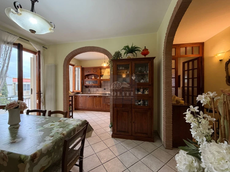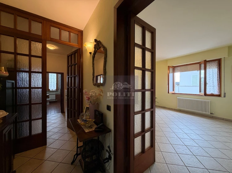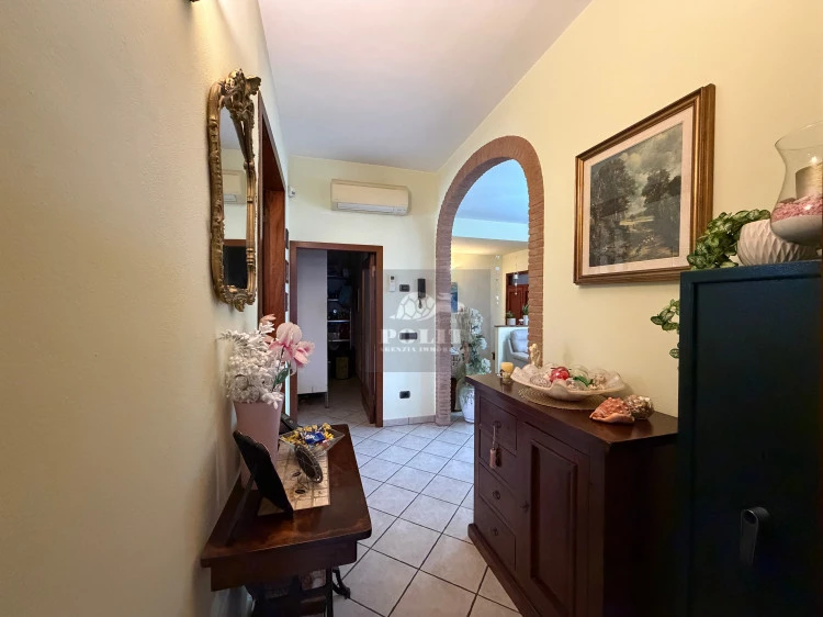 L’ingresso si apre su un pratico disimpegno con armadio a muro che conduce direttamente all’ampia e luminosa zona giorno. La sala è valorizzata da un elegante arco in mattoni che la collega armoniosamente alla cucina, creando un ambiente accogliente e funzionale. La presenza di una porta finestra garantisce un accesso diretto allo splendido terrazzo angolare, perfetto per momenti di relax all’aperto o per pranzi e cene in compagnia.